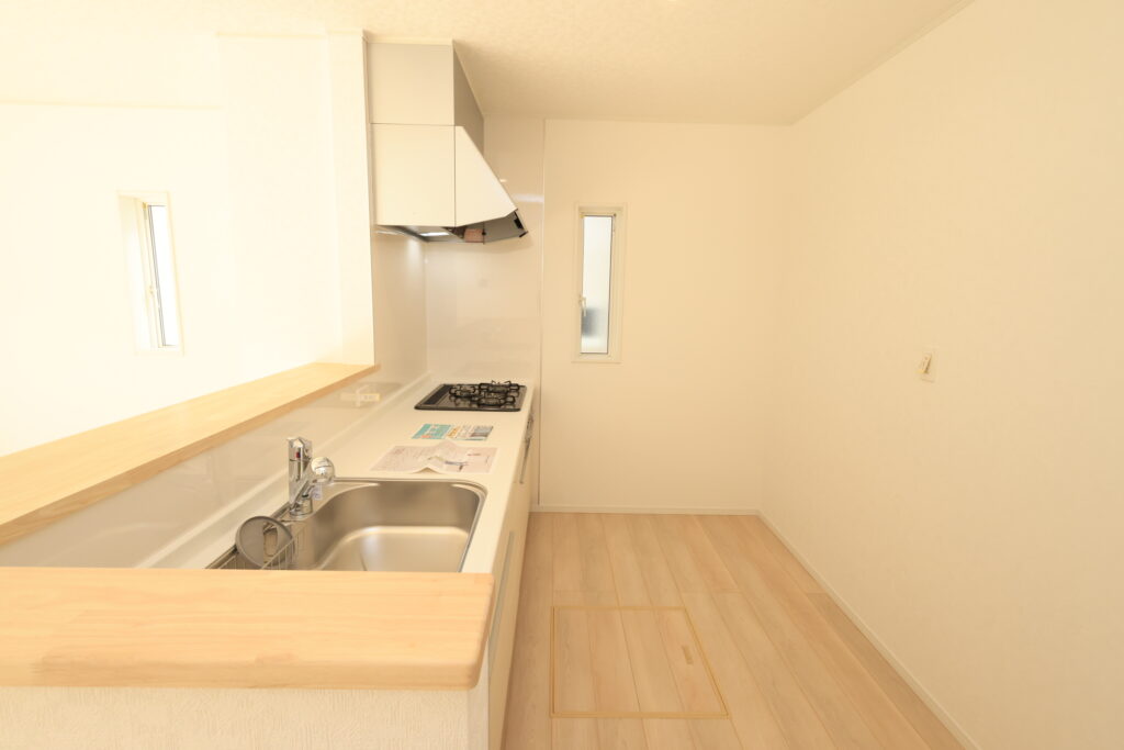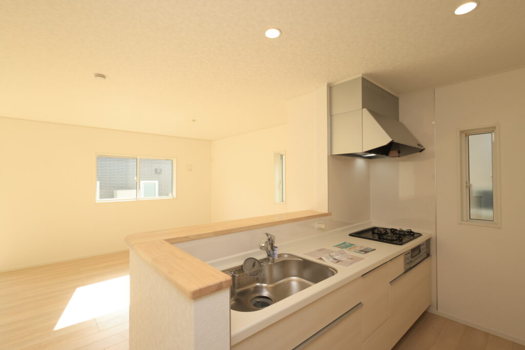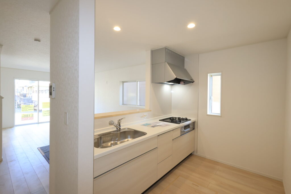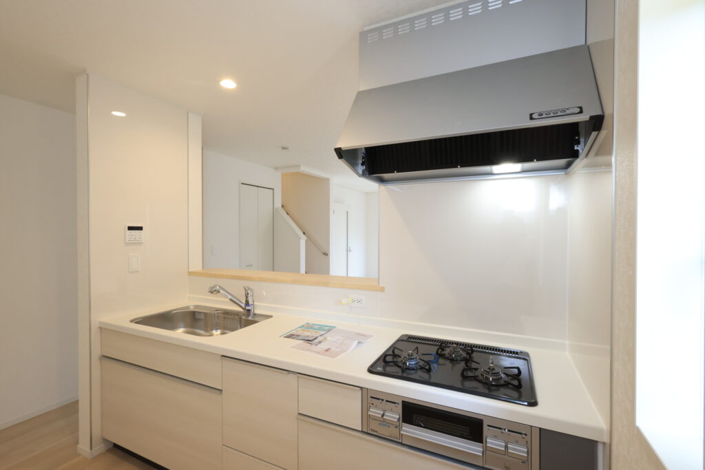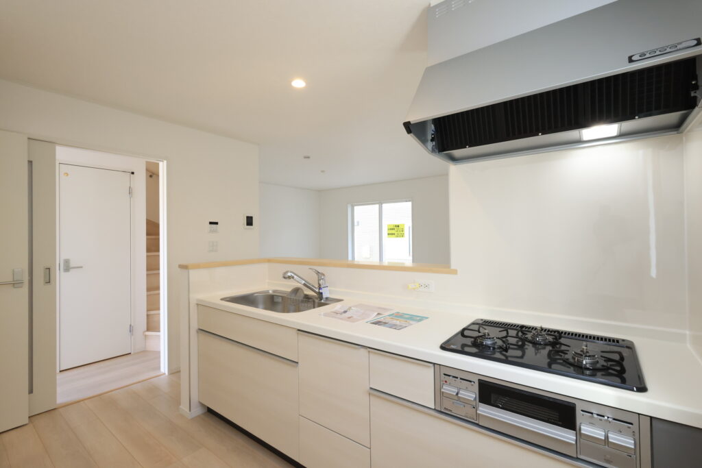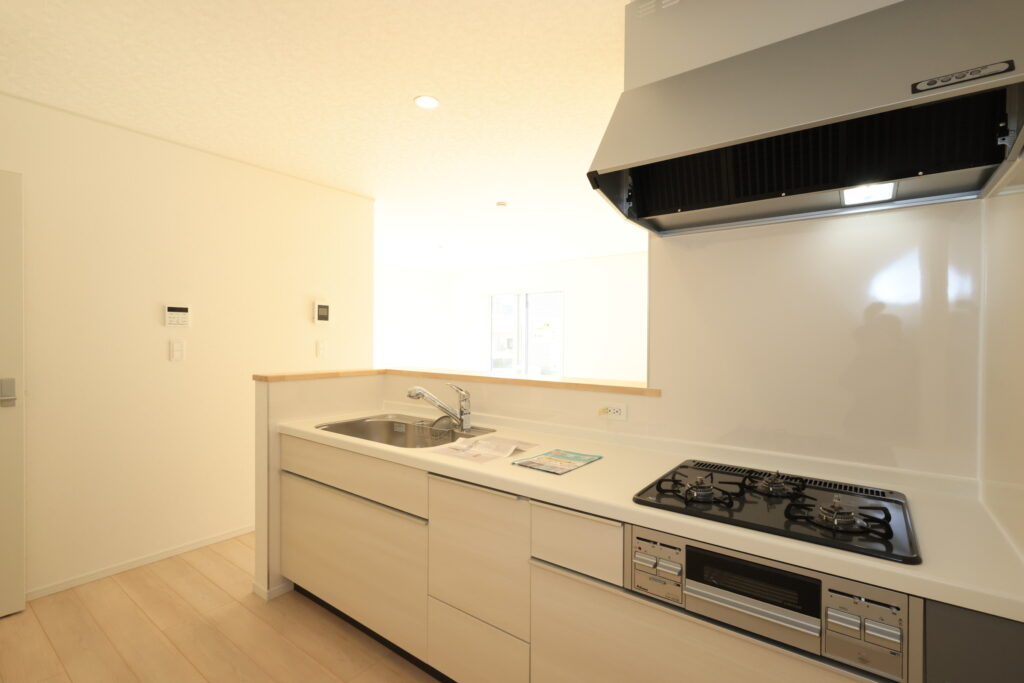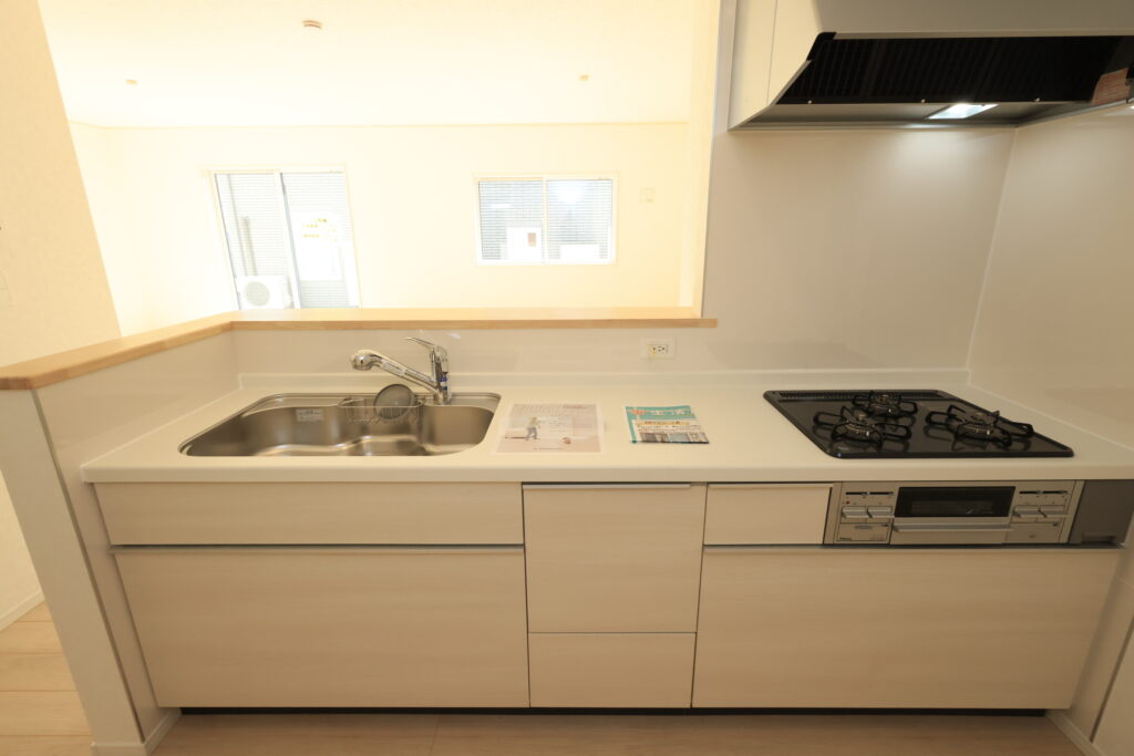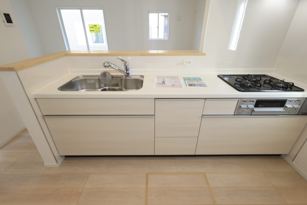 ・防犯カメラ・全室2面採光・人感センサー照明・TV付きインターホン・玄関収納・キッチンはオールインワン浄水栓・3口コンロ・床下収納・浴室暖房乾燥換気システム・追い焚き、オートバス