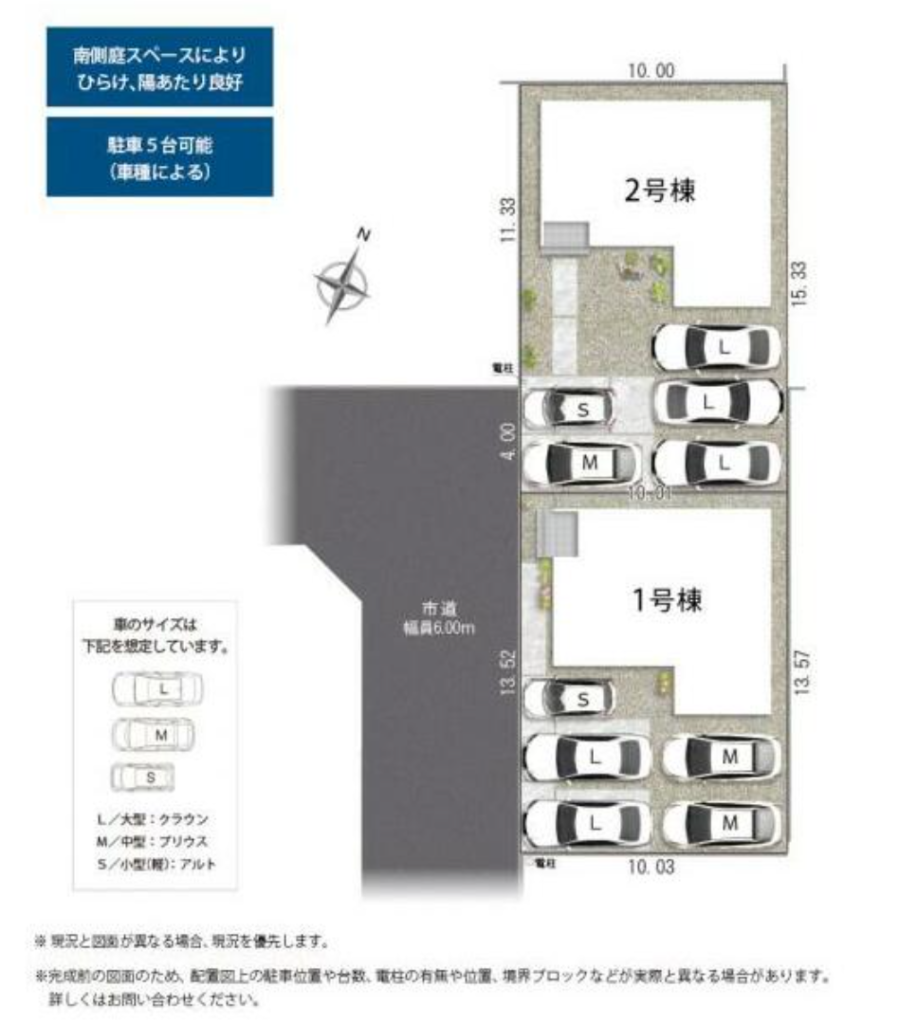 駐車5台可(車種による)+南側がひらけた庭スペース。