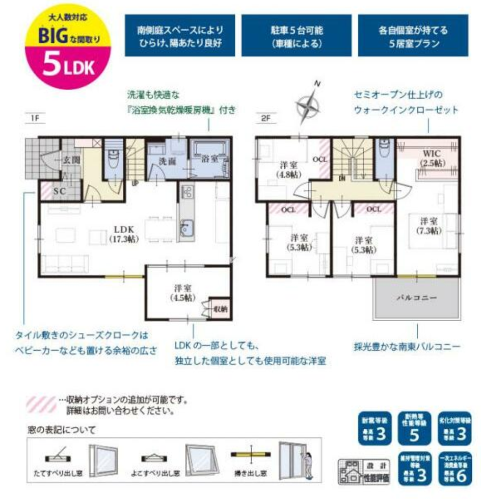 LDK17.3帖×5LDKで、家族それぞれの部屋をつくりやすい新築です。