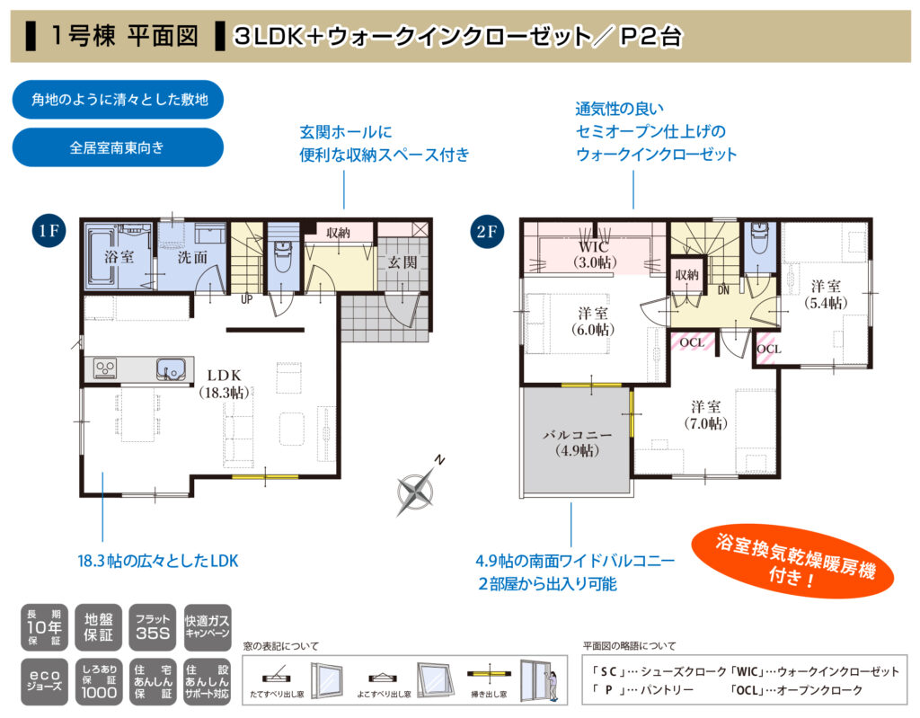 ・全室2面採光・ecoジョーズ・トイレ2箇所・人感センサー付き照明・複層ガラス・TV付きインターホン・対面キッチン・WIC・リビング階段
