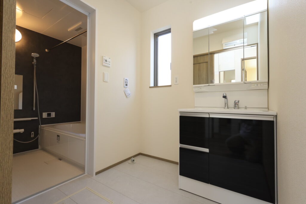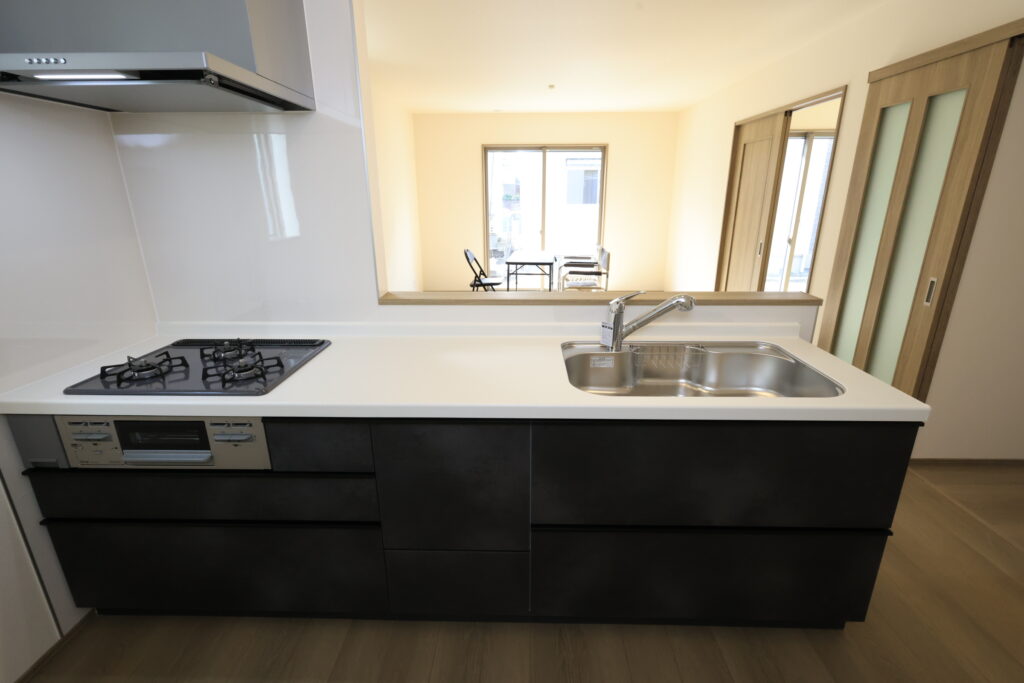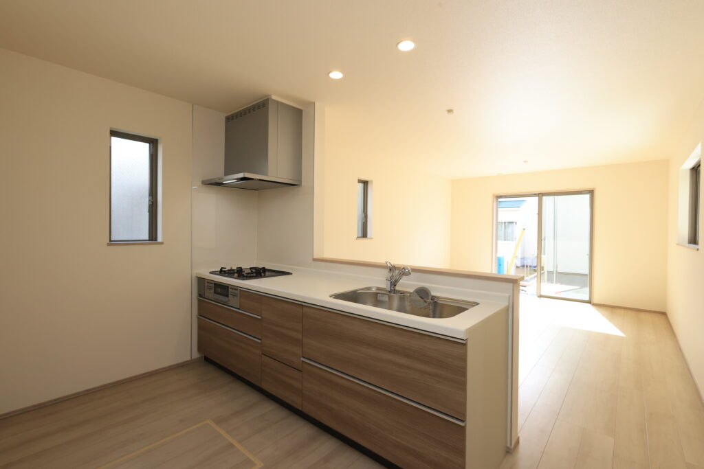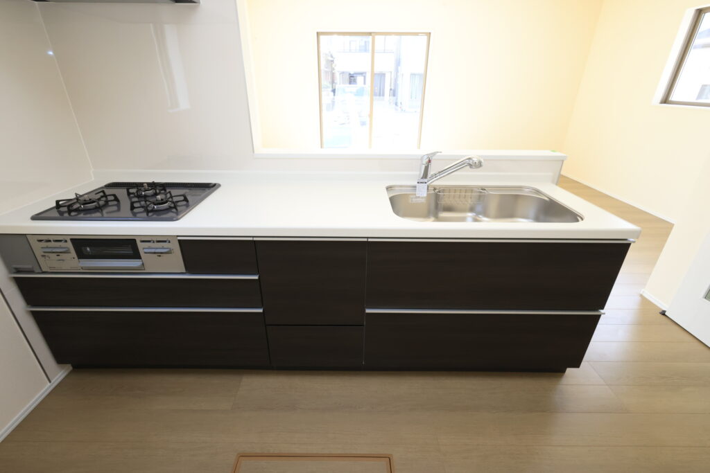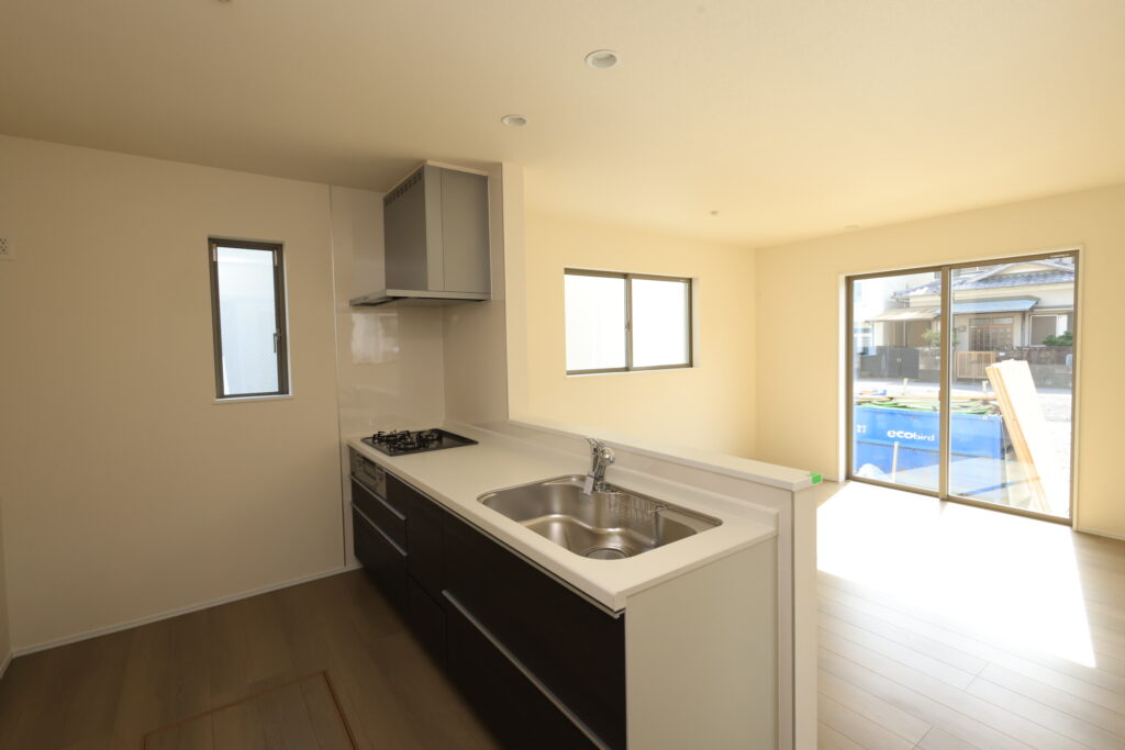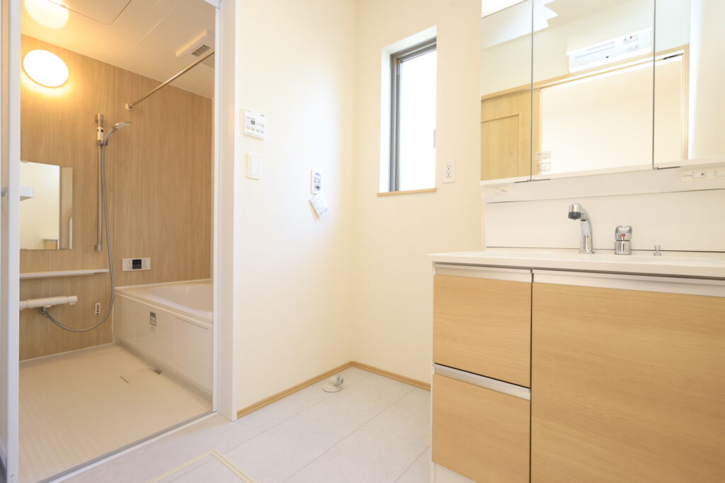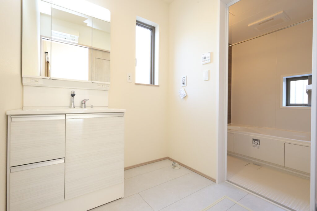 【設備】:24時間換気、複層ガラスサッシ、TVドアホン、シャワートイレ、1坪タイプのシステムバス、シャンプードレッサー、オールインワン浄水栓 など。