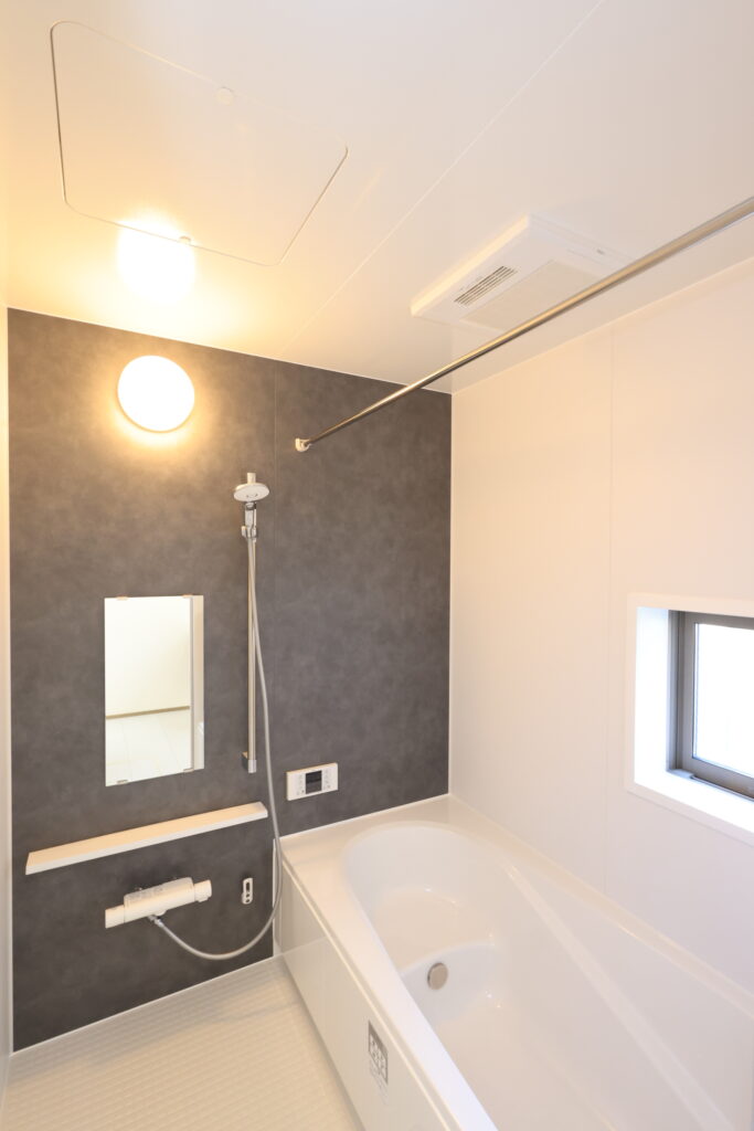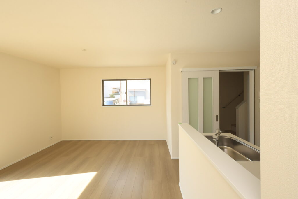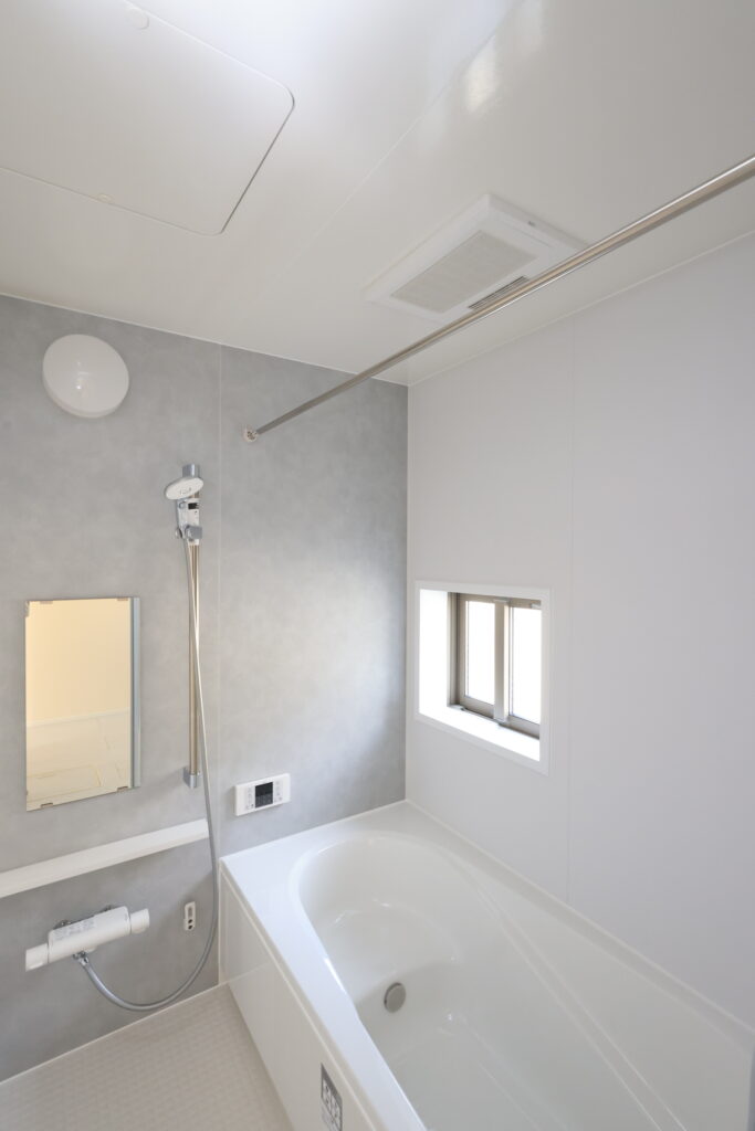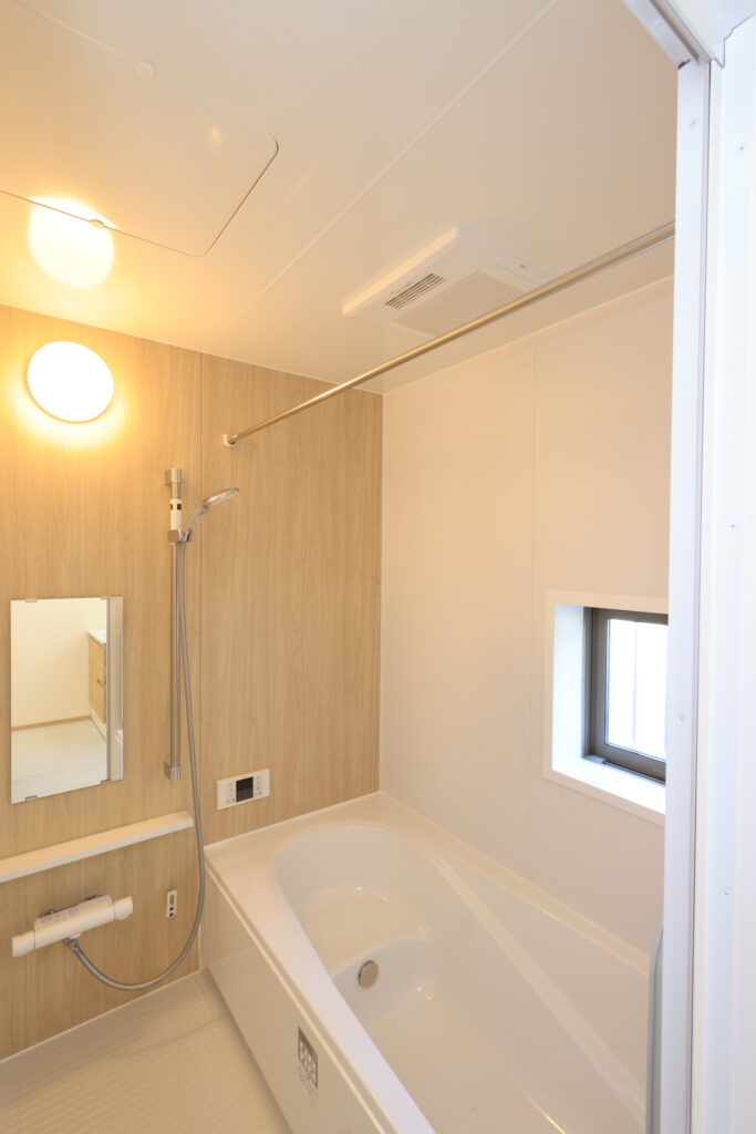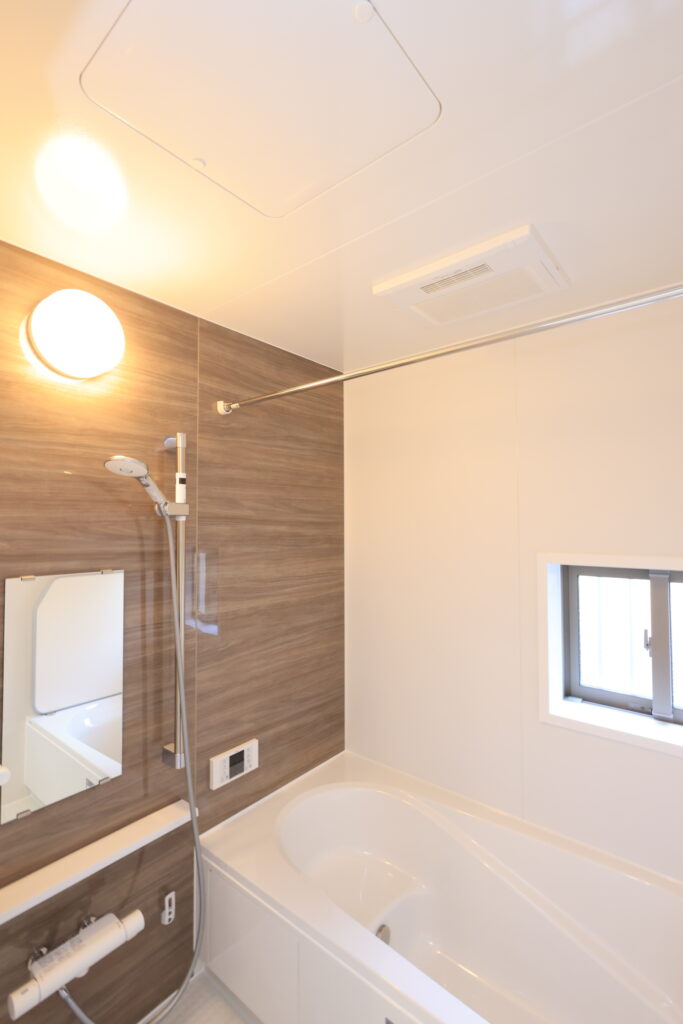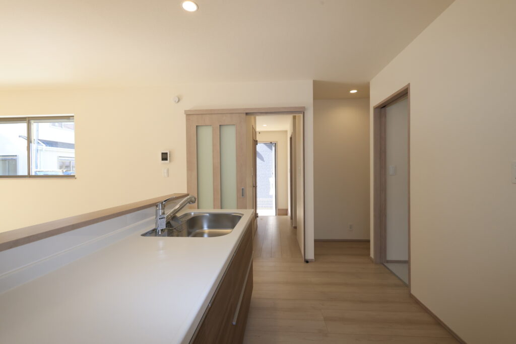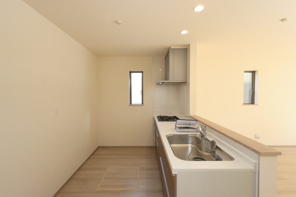 【設備】:24時間換気、複層ガラスサッシ、TVドアホン、シャワートイレ、1坪タイプのシステムバス、シャンプードレッサー、オールインワン浄水栓 など。