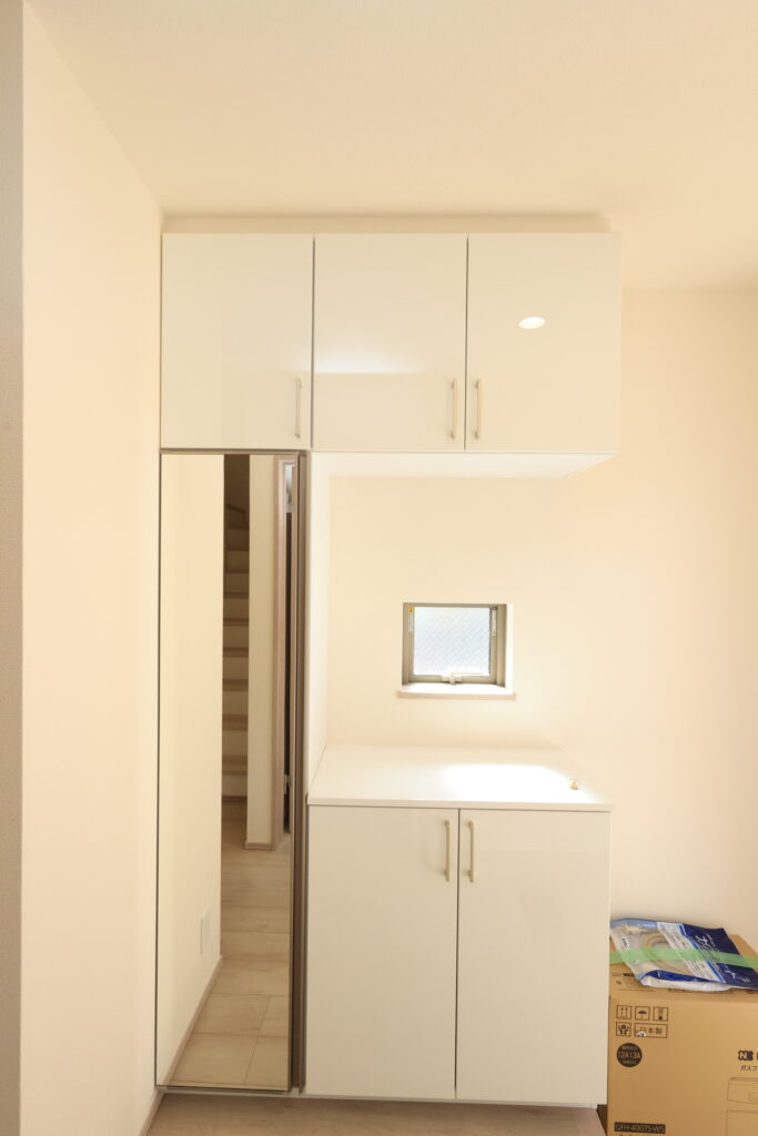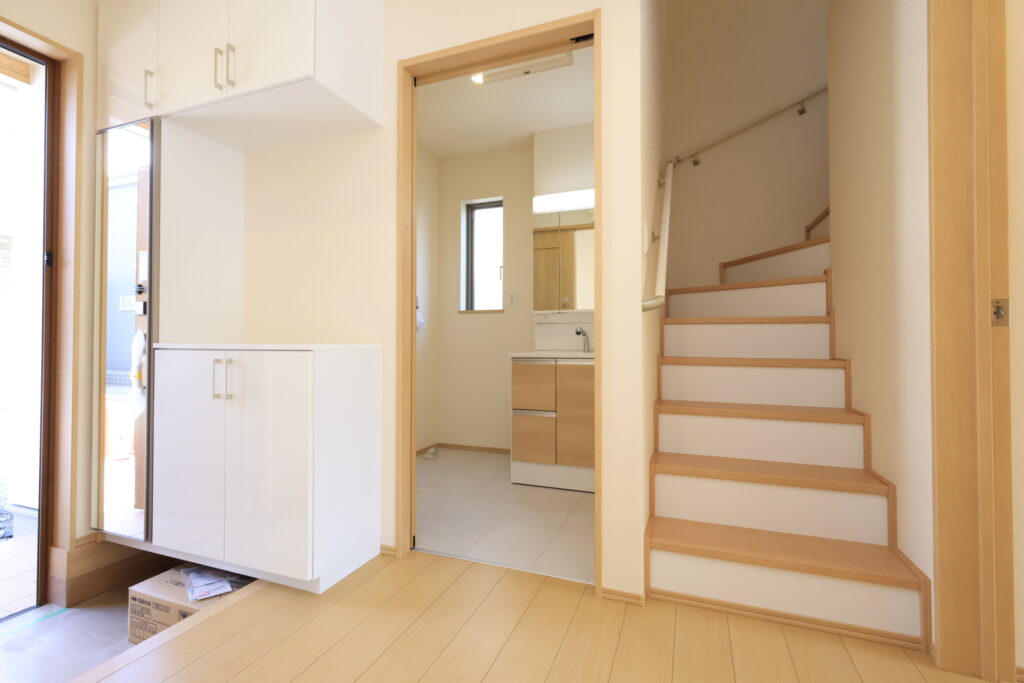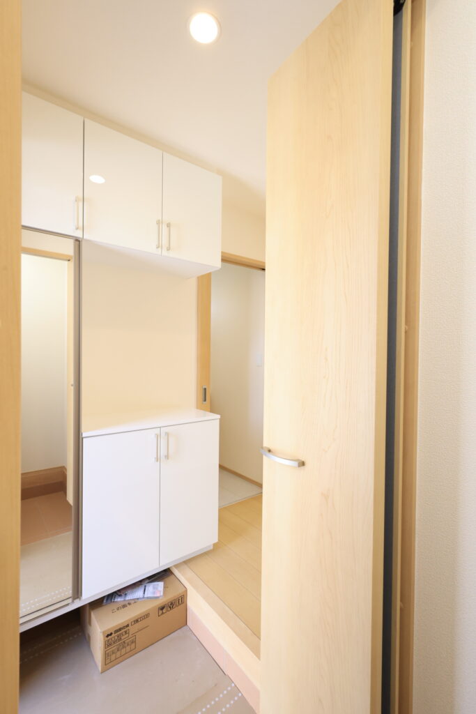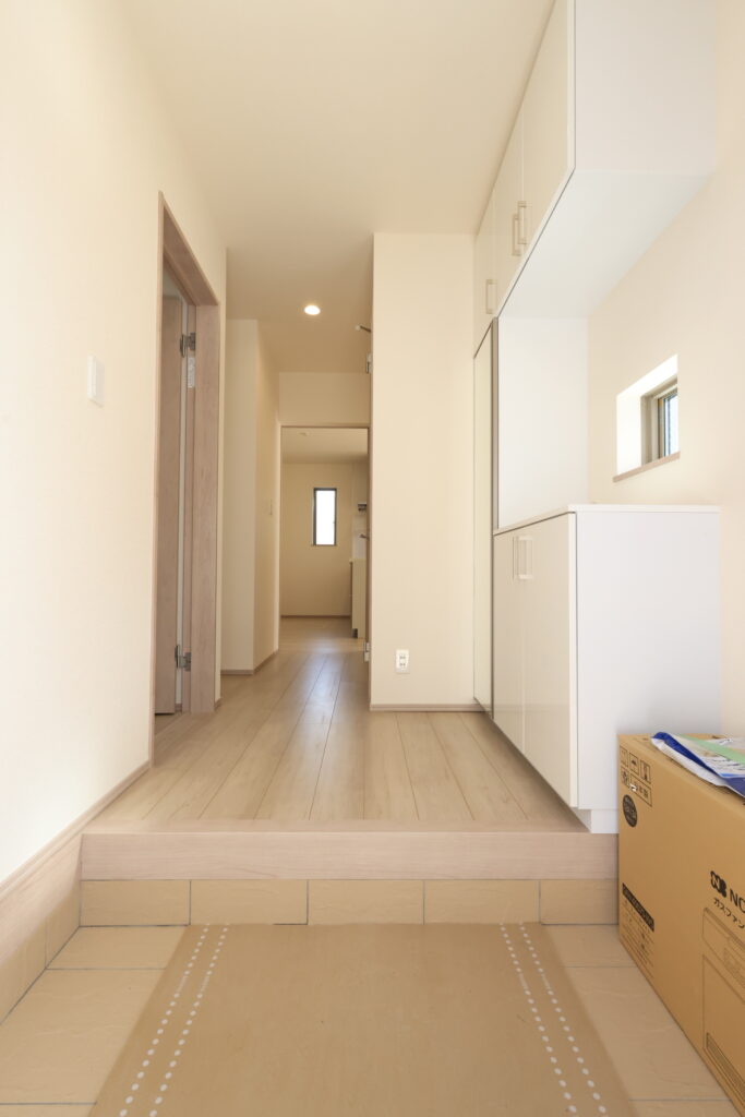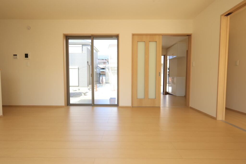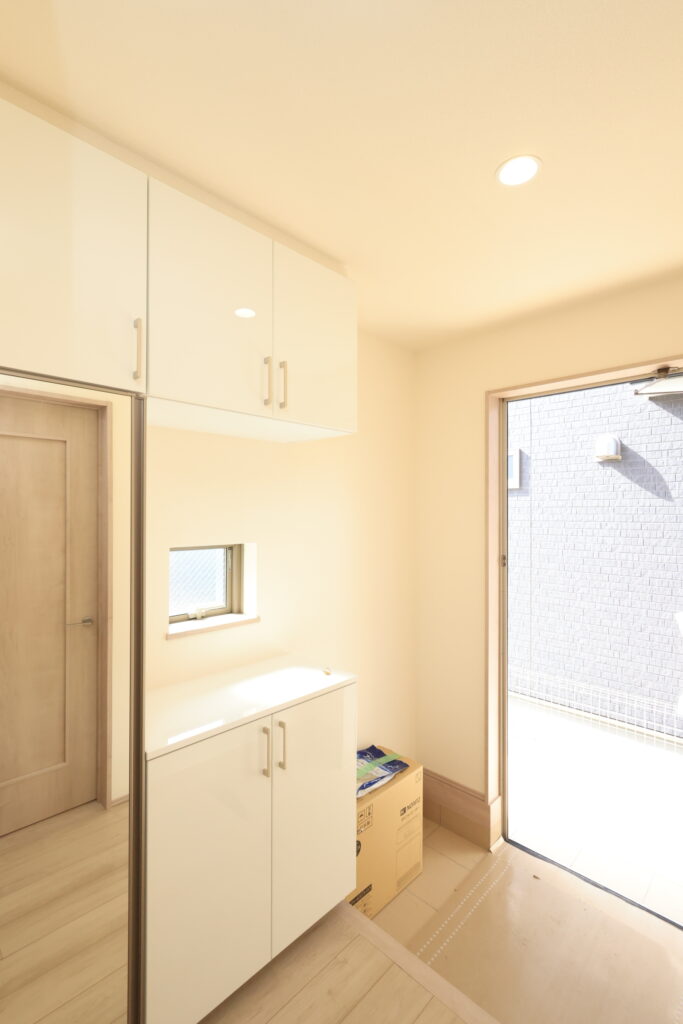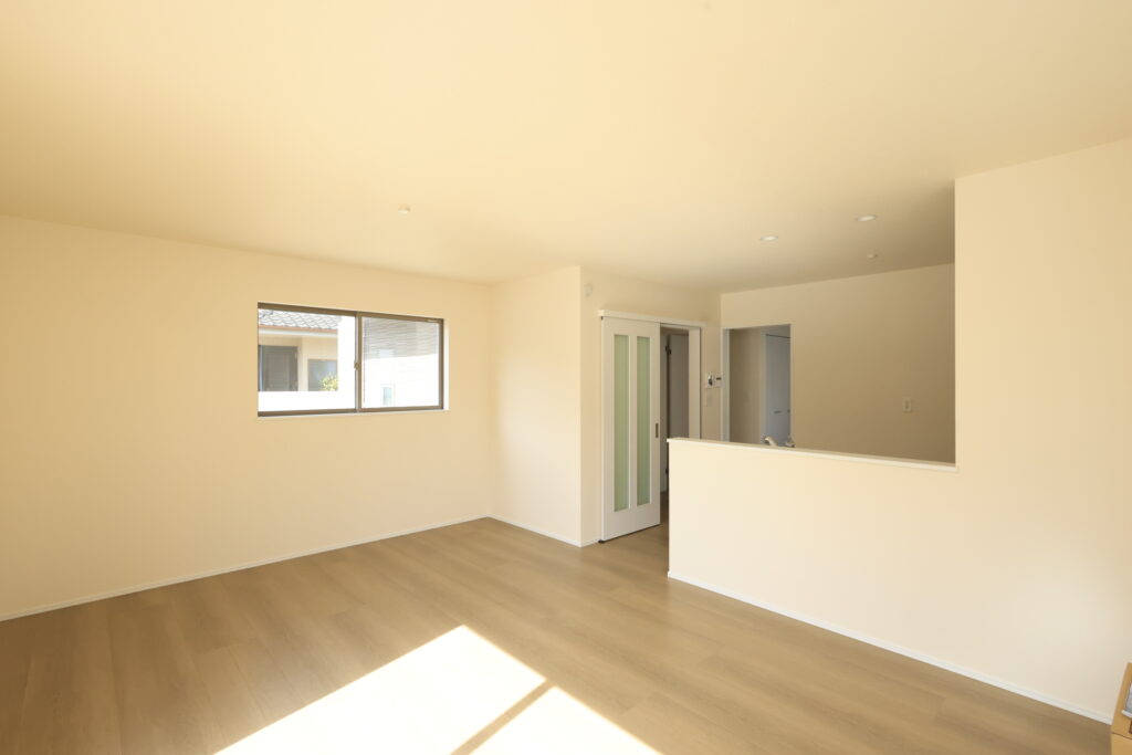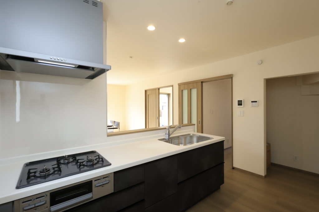 【設備】:24時間換気、複層ガラスサッシ、TVドアホン、シャワートイレ、1坪タイプのシステムバス、シャンプードレッサー、オールインワン浄水栓 など。