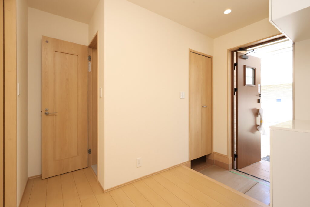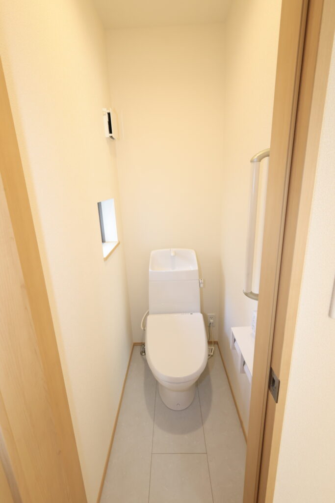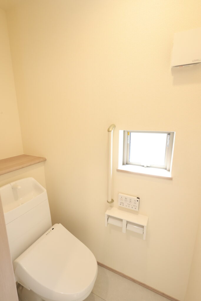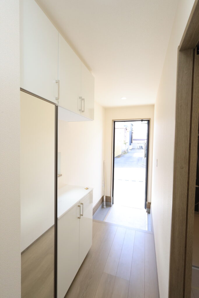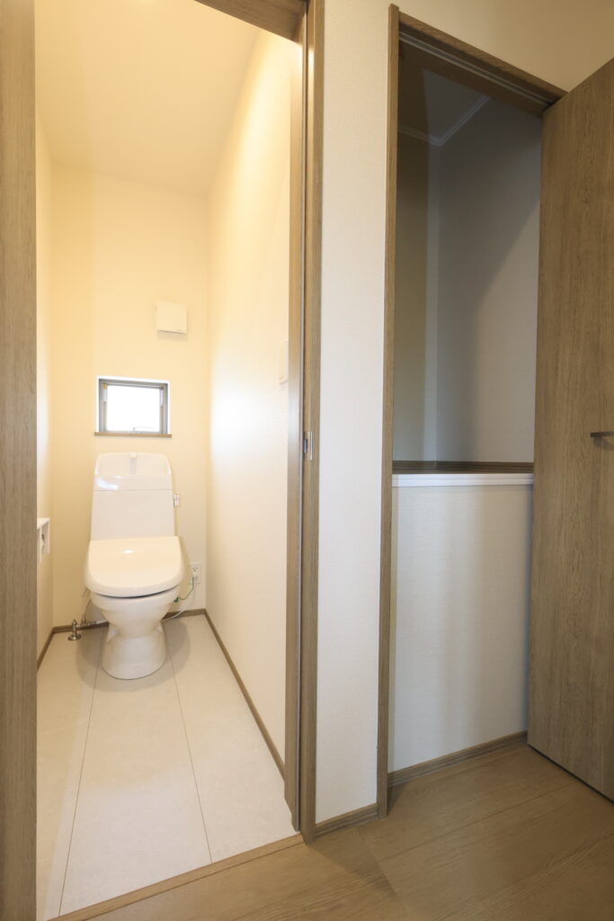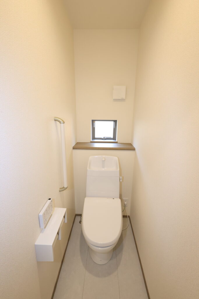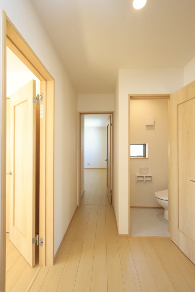 【設備】:24時間換気、複層ガラスサッシ、TVドアホン、シャワートイレ、1坪タイプのシステムバス、シャンプードレッサー、オールインワン浄水栓 など。