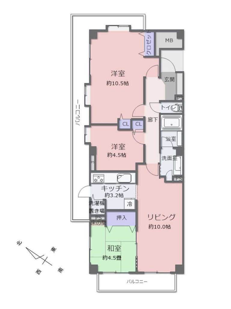 ・洋室10.5帖、洋室4.5帖、和室4.5帖があり、家族それぞれの空間を持ちやすい間取りです