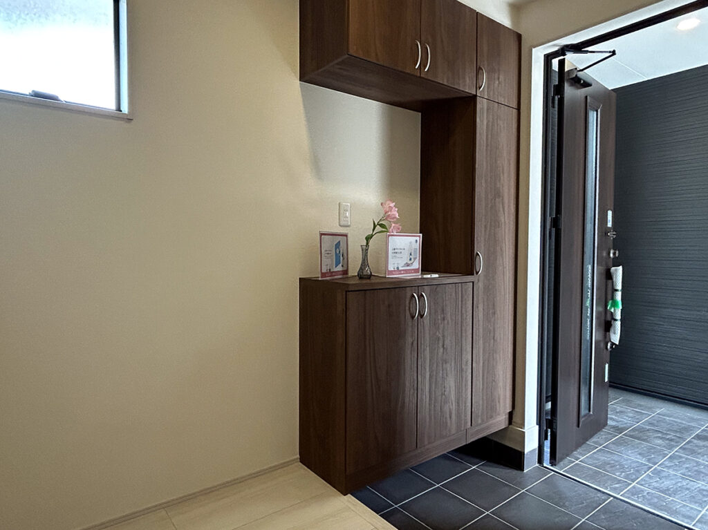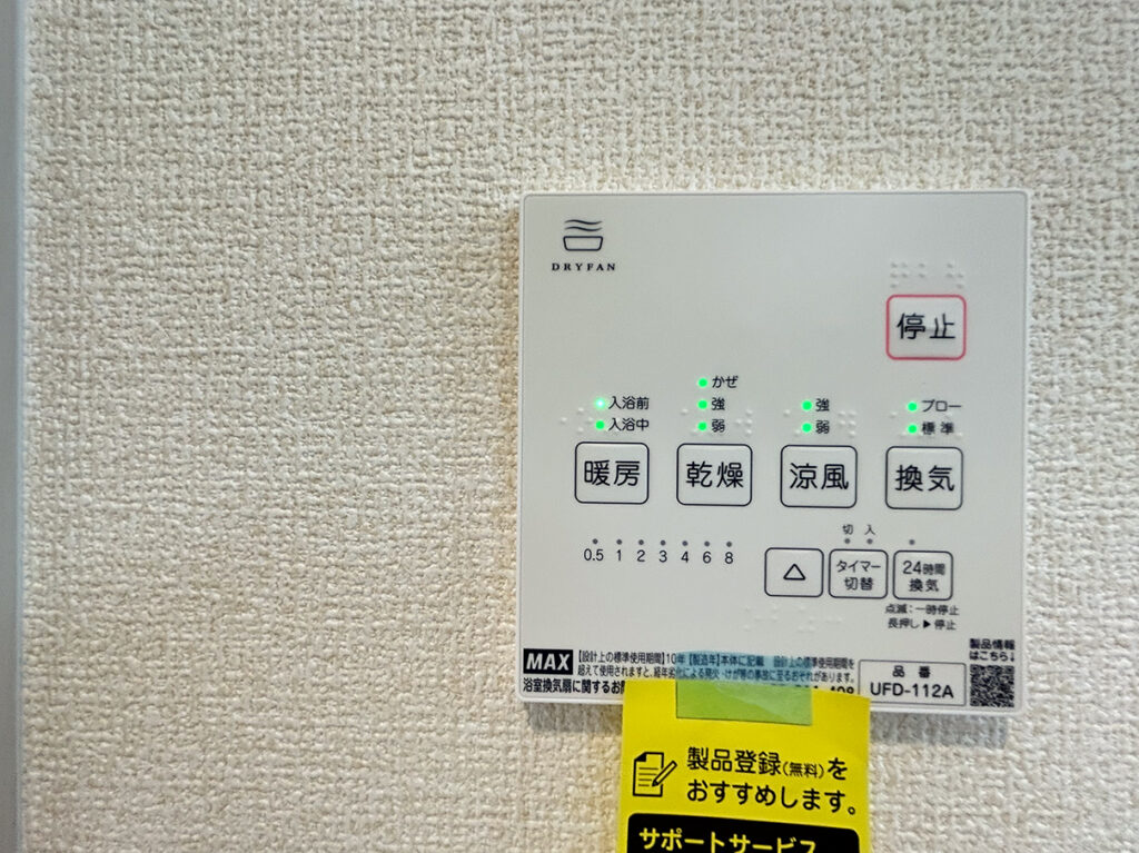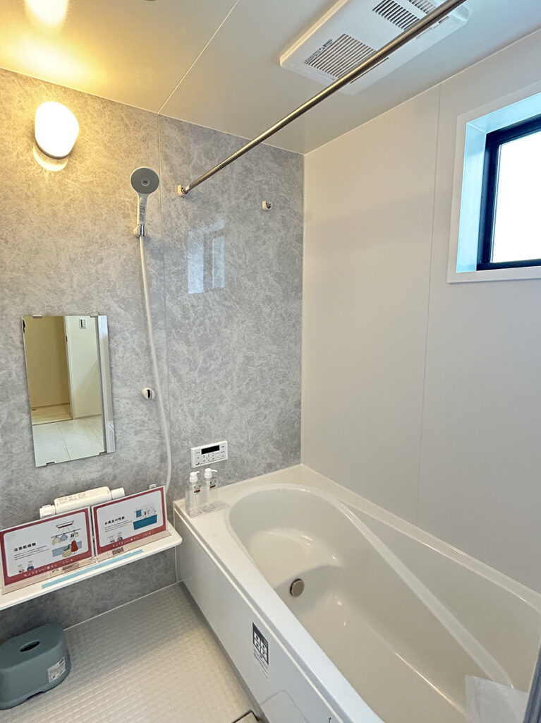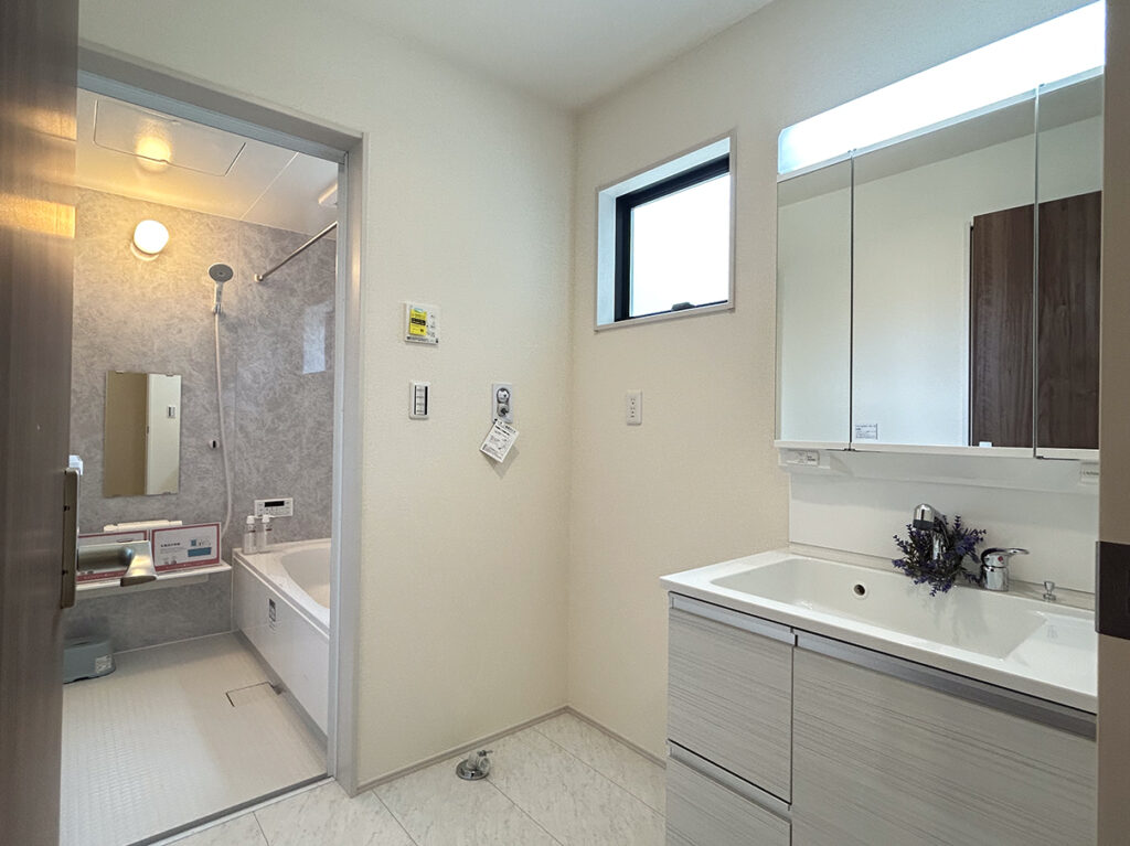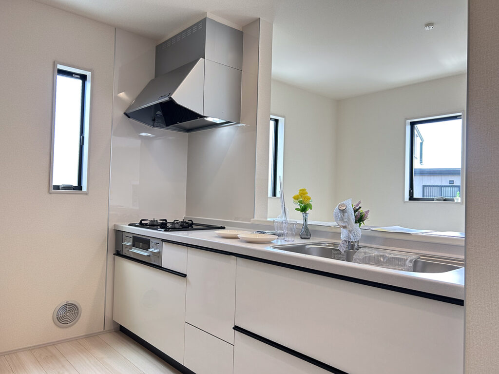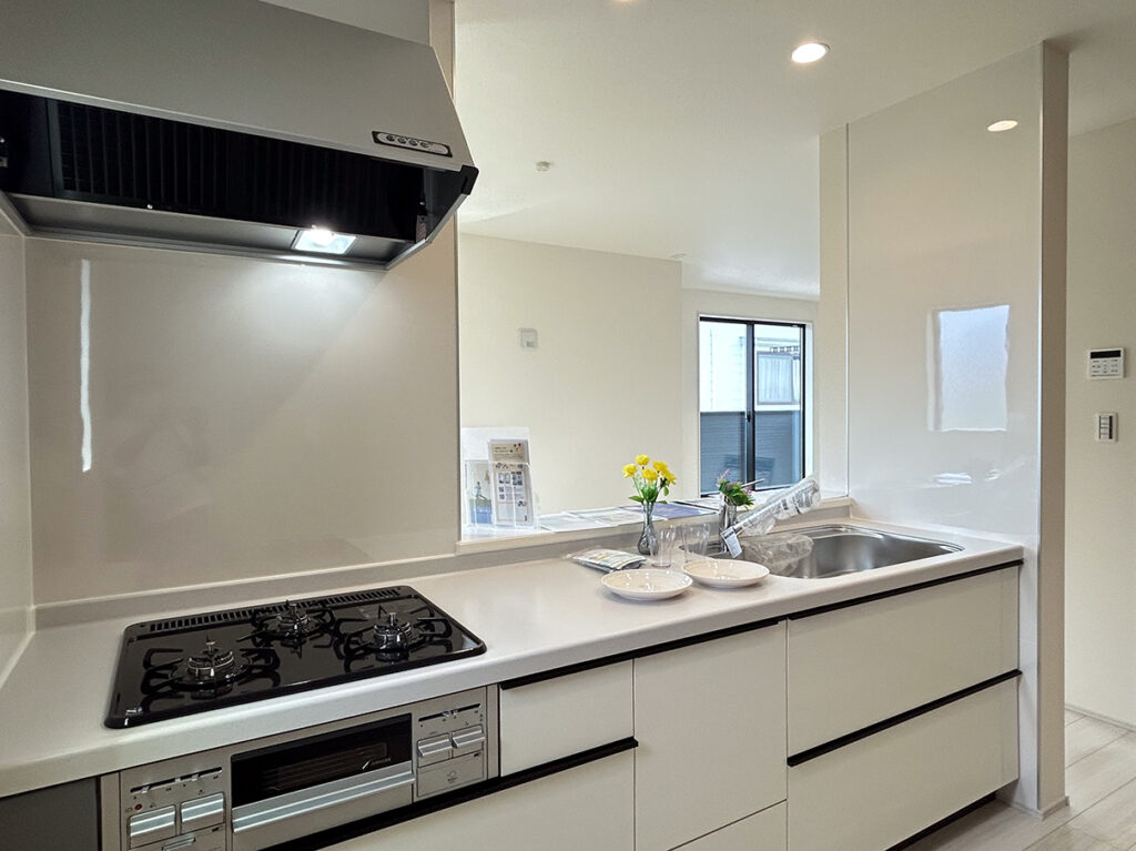 ペアガラスや24時間換気システムなど基本仕様に加え、床下収納、シャワートイレ、TVドアホン、浴室換気乾燥暖房機など日々の使いやすさを支える設備が揃っています。地盤保証20年、フラット35Sにも対応しています。