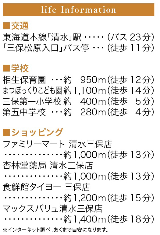 | 交通 | 『三保松原入口』バス停徒歩11分/450m JR『清水駅』バス搭乗23分/8100m |